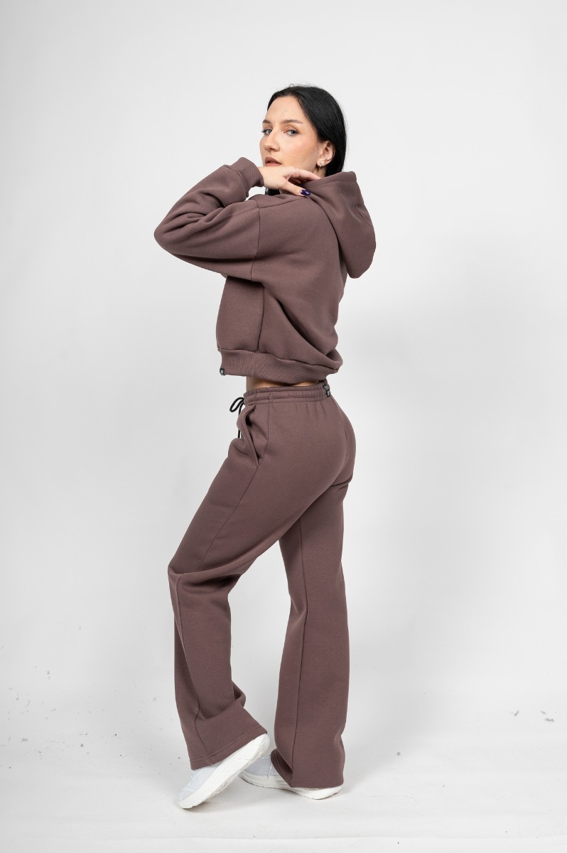 Γυναικείο Free Style Set Καφέ – Crop με Κουκούλα και Ίσιο Παντελόνι